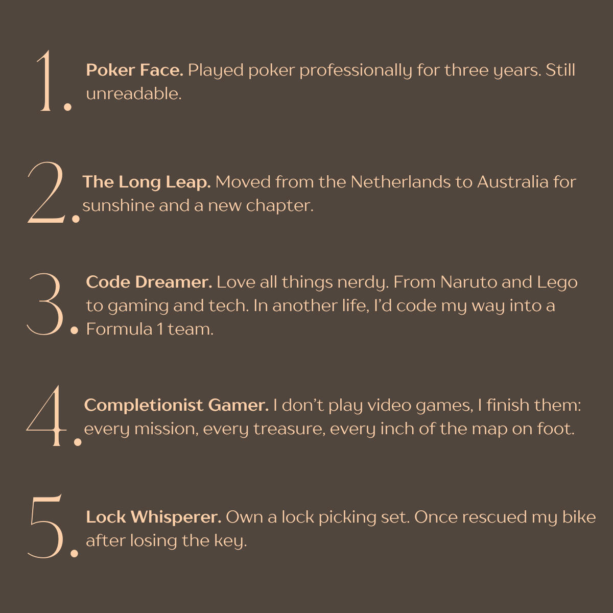 I care about progress, not performance. My role is not to take the spotlight but to help build the stage where the organisation can shine. Whether it is perspective in a tough decision, hands-on help in a gap, or solving the kind of problem no one else has time for, I bring calm structure and clarity that leaders can trust.I have worked in different functions across the organisation. Not as the expert in every area but as the person who understands how it all connects. With logic, common sense and a drive to make things work, I step in where it is needed most and make sure leaders have the space and focus to lead.What I enjoy most is helping people and companies grow. I want to see founders and teams win, and I thrive when I can be the trusted partner by their side. Sparring when needed, holding things steady when it counts, and making sure progress does not stall.Because every leader deserves a Win(g)man.